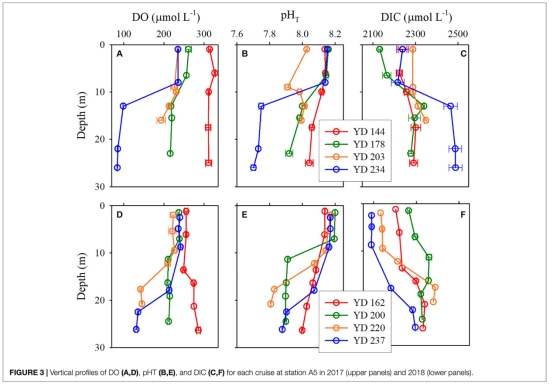 ? 化學參數:DO(Winkler滴定法)、pH(NBS標度轉換至總氫離子標度)、DIC(TOC分析儀)(圖3)。