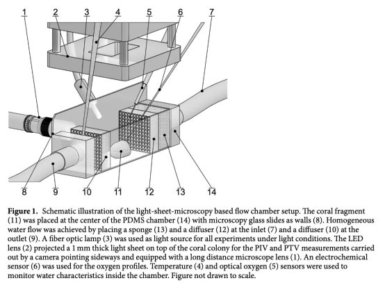 研究通過新型光片顯微鏡流室系統,結合微粒測速技術和高分辨率氧分析,探究了珊瑚(Porites lutea)纖毛運動在模擬環境水流和光照條件下對擴散邊界層(DBL)內氧氣動力學的調控作用。結果顯示:纖毛產生的渦流可顯著緩解組織表面的極端氧濃度(光照下氧過剩降低至25 μM,黑暗時氧短缺降至86 μM),但不影響光合效率或整體氧通量。這表明纖毛渦流是珊瑚維持體內穩態的關鍵機制,可能增強其環境脅迫下的恢復力。
