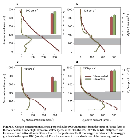 ? 數據:纖毛活動使光照下組織表面氧濃度從350 μM降至25 μM(較環境值),黑暗時從120 μM缺氧緩解至86 μM。