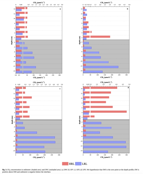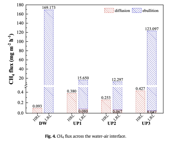 ? 高水位期(HRL):上游CH?擴散通量(0.253–0.427 mg m?2 h?1)高于下游(0.093 mg m?2 h?1),與沉積物CH?空間分布一致(圖4)。
