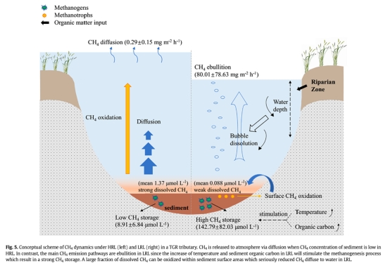 3. 關鍵驅動:水位波動通過河岸侵蝕增加下游TOC,同時淺水環境促進冒泡,而甲烷氧化無法完全抵消高生成量。