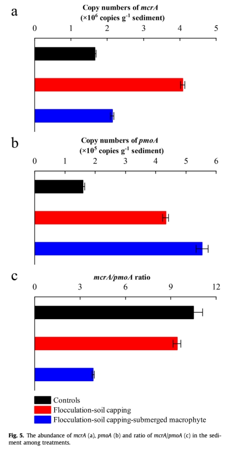 2. 微生物群落調控:系統降低產甲烷菌基因(mcrA)豐度,增加甲烷氧化菌基因(pmoA)豐度(圖5),改變藻類碳的代謝路徑。