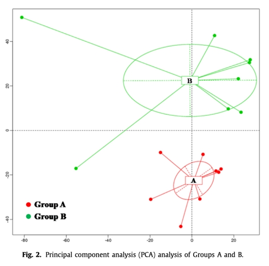 ? 數(shù)據(jù):A組特有脯氨酸、甘氨酸、酪氨酸;B組丙氨酸豐度更高,甲硫氨酸占比達66.24%。