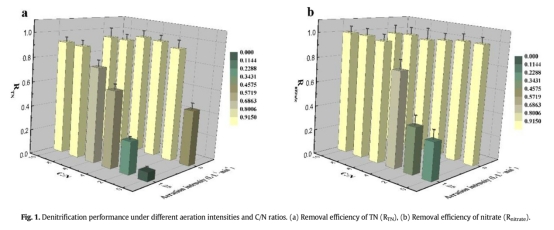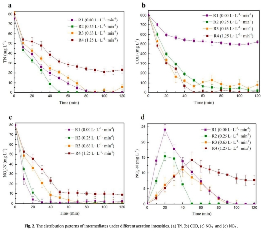 研究通過調控曝氣強度(0.00、0.25、0.63、1.25 L/(L·min)),探究溶解氧(DO)對混合菌群反硝化性能的影響機制: