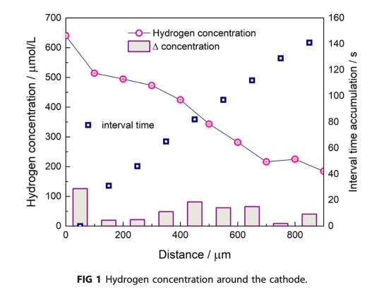 1. 陰極附近不同距離的氫濃度梯度(來自圖1):研究意義在于直接證明了陰極表面產生了氫氣,并且其濃度隨著遠離電極表面而降低,特別是在生物膜厚度范圍內(約100μm內)出現急劇下降,表明生物膜 actively 消耗了氫氣。
