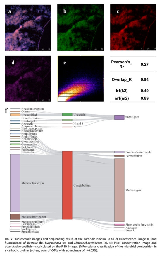 2. 生物膜內的微生物(細菌和古菌)協作消耗了在陰極產生的氫氣。