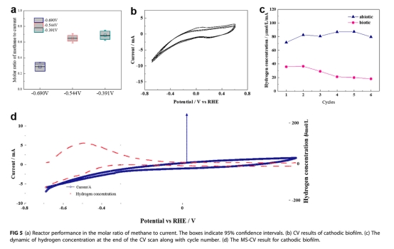5. 不同外加電壓(對應不同陰極電位)下的甲烷產量、氫氣產量、電流以及摩爾電子產甲烷率(來自圖5a):研究意義在于展示了操作電位對兩種電子轉移途徑的相對重要性的調控作用,表明更負的電位有利于氫產生但可能降低甲烷轉化的電子效率。