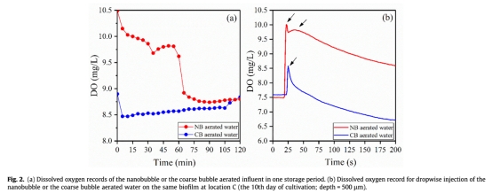 2 揭示傳質機制:通過生物膜內DO深度剖面(未直接顯示圖,但基于剖面計算fD)和一次注射測試(圖2b),發現NB注水后出現第二波DO峰值(9.379–9.824 mg/L),證實NB在生物膜內部分解釋氧,縮短氧擴散距離,增強傳質效率。