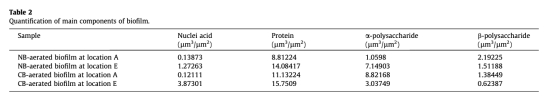 6 形態特性:CLSM圖像顯示的生物膜組分空間分布(Table 2)、AFM表面形貌。研究意義:NB曝氣生物膜邊緣區域核酸和α-多糖含量高,表明微生物群落和代謝途徑改變;表面疏水性變化影響生物膜形成和更新。