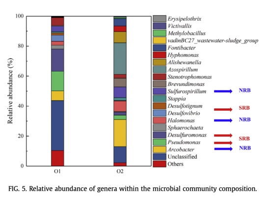 3. 微生物群落變化:來自Fig. 5,顯示SRB(如Desulfuromonas、Desulfovibrio)豐度下降,NRB(如Arcobacter、Sulfurospirillum)豐度上升,意義在于揭示DO去除后微生物競爭關系變化,抑制腐蝕性菌群。