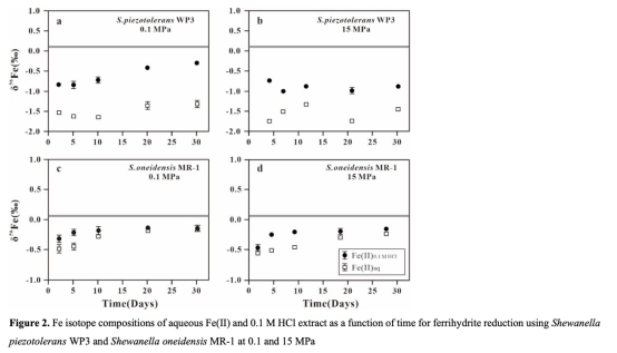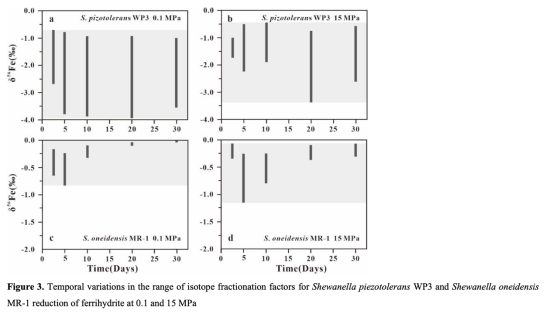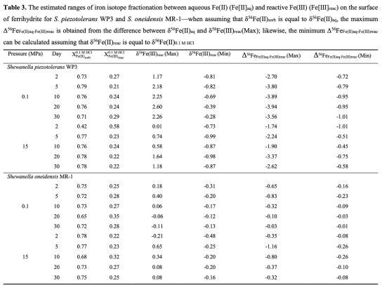 6. 估算的Δ56FeFe(II)aq-Fe(III)reac范圍隨時間變化的示意圖。該圖強調了S. piezotolerans WP3和S. oneidensis MR-1實驗估算出的分餾范圍存在顯著差異,且后者遠離-3‰的平衡值。數據來自圖3。