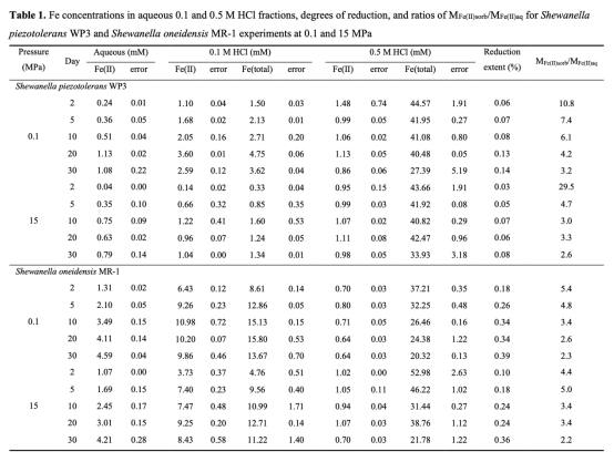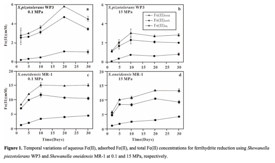 通過選擇高反應活性的鐵礦物(水鐵礦)作為終端電子受體,并選用兩種不同的希瓦氏菌(S. piezotolerans WP3 和 S. oneidensis MR-1)在兩種不同壓力(0.1 MPa 和 15 MPa)下進行微生物還原實驗,以獲取差異顯著的還原程度。在不同時間點取樣,分離并測量不同鐵物相(水相Fe(II)、吸附態Fe(II)、剩余礦物等)的濃度和鐵同位素組成。利用同位素質量平衡模型估算Fe(II)aq與Fe(III)reac之間的同位素分餾范圍,并結合吸附態Fe(II)的濃度變化,探討其與同位素分餾行為的關系,從而揭示分餾機制。