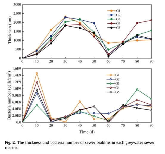 1. 生物膜厚度與細菌總數(來自圖2):生物膜厚度在90天內呈現周期性變化,細菌數量穩定在約4×10^8 cells/cm2。該數據揭示了灰水SDGS中生物膜獨特的生長動力學(非傳統穩定增厚),為其獨特的微環境提供了物理基礎。