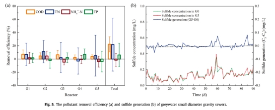 5. 硫化物生成量(來自圖5b):整個系統(1000米)的硫化物生成量極低,最高值僅約0.08 mg/L,遠低于傳統污水下水道。該數據是本研究最關鍵的發現之一,證實了灰水SDGS在控制硫化物腐蝕和異味方面的巨大優勢。