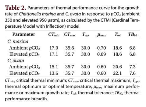 2. CO2濃度升高(海洋酸化)對大多數基礎溫度參數無顯著影響:C. marina的CTmin、CTmax、Topt均無變化;兩種藻的CTmax (~35.7°C) 和 Topt (~30.0°C) 在不同pCO2下保持一致。