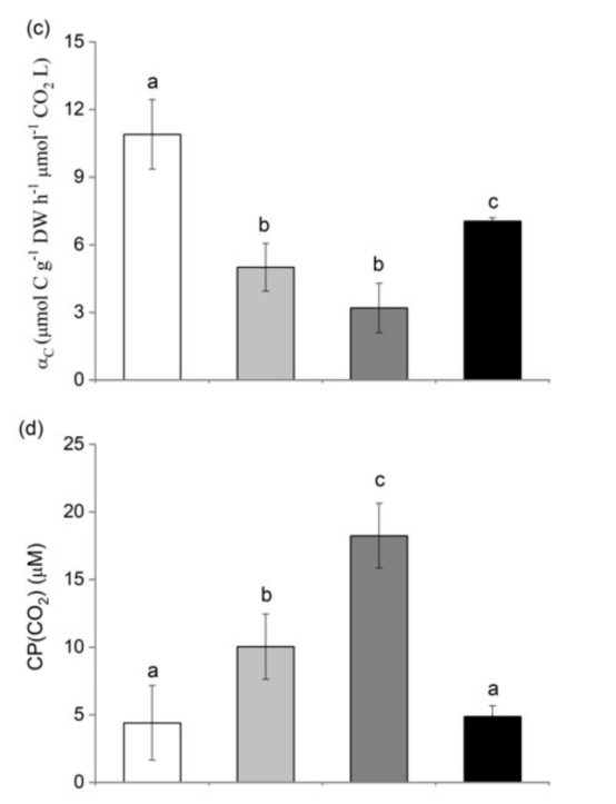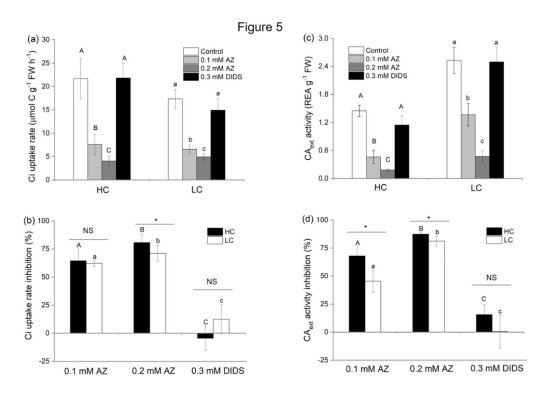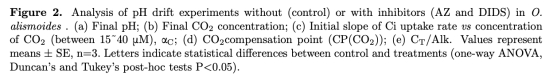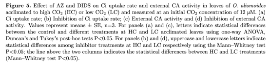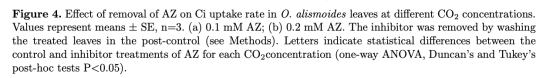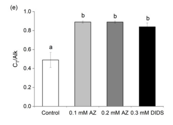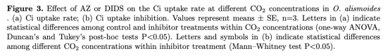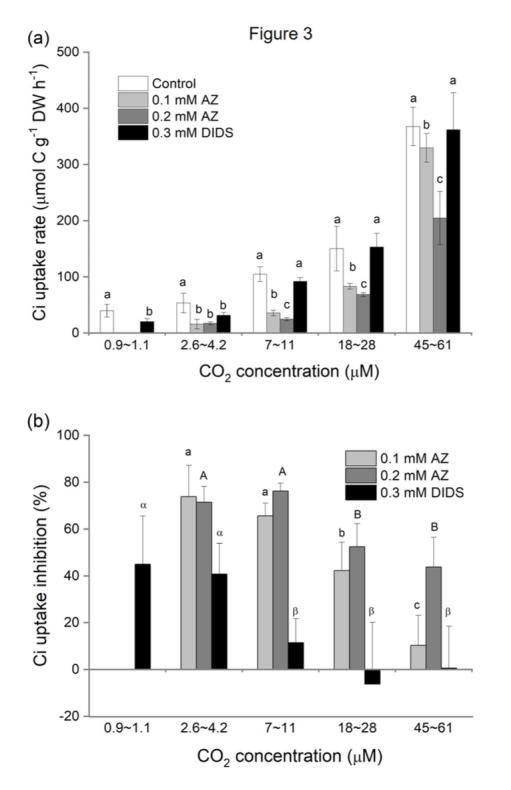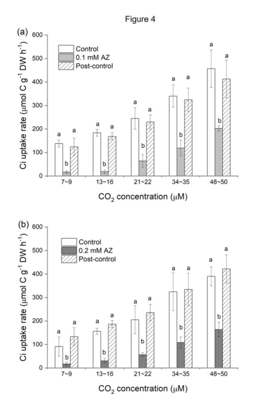 2. Ci吸收速率與CO2濃度的關(guān)系(來自圖3和圖4):在不同CO2水平下測(cè)量Ci吸收速率,分析抑制劑對(duì)斜率(αC)和CO2補(bǔ)償點(diǎn)的影響。研究意義在于區(qū)分被動(dòng)CO2擴(kuò)散與主動(dòng)HCO3-轉(zhuǎn)運(yùn)的貢獻(xiàn),并揭示AZ和DIDS對(duì)碳獲取效率的抑制程度(圖3a,b)。