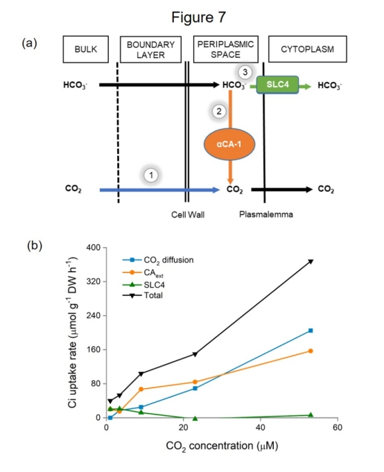 4. 碳獲取模型量化(來自圖7):基于實(shí)驗(yàn)數(shù)據(jù),計(jì)算CO2擴(kuò)散、HCO3-轉(zhuǎn)化(aCA-1介導(dǎo))和HCO3-轉(zhuǎn)運(yùn)(SLC4介導(dǎo))的貢獻(xiàn)比例。研究意義在于提供量化框架,解釋不同碳濃度下各機(jī)制的動(dòng)態(tài)權(quán)重(圖7b)。