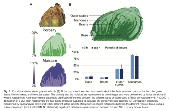 ? 測量數據: trichomes(毛狀體)孔隙度最高(77%),外層鱗片30%,綠色組織12%;基部孔隙度最低(8-10%)