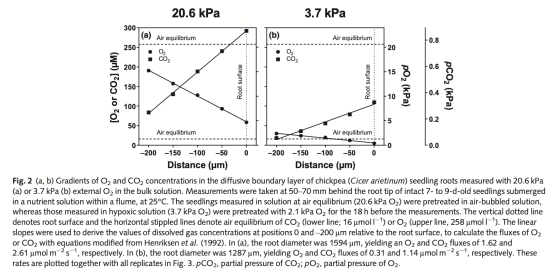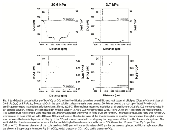 本研究利用新型CO?微傳感器和O?微傳感器,首次測量了鷹嘴豆幼苗根系在通氣與低氧條件下的徑向O?和CO?濃度分布。研究發現: