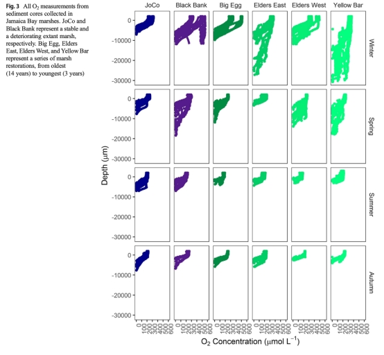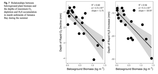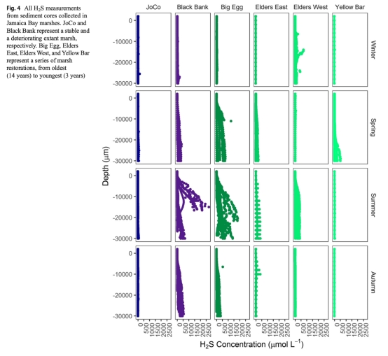 摘要指出濕地恢復的生態機制鮮少被評估。在富營養化河口中,沉積物硫化氫積累可能加速鹽沼退化,其驅動機制涉及濕地植物生長與微生物氧化還原反應的復雜反饋。研究利用紐約牙買加灣城市富營養化河口的恢復鹽沼時間序列,結合穩定現存沼澤與退化沼澤的對比,通過沉積物氧和硫化物微剖面分析,發現夏季沉積物氧濃度最低、硫化物濃度最高。硫化物積累與潮汐淹沒時長呈正相關(如退化沼澤Black Bank淹沒9.4小時/天),而植物根系生物量增加可促進氧擴散至深層沉積物,降低硫化物毒性,增強鹽沼對海平面上升的韌性。