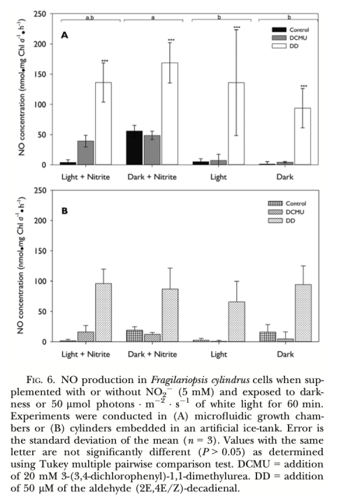 2. 環境響應: 溫度升高(>0°C,尤其是7.7°C)和高鹽脅迫(>38)均可誘導NO產生,同時伴隨光合效率(Fv/Fm)下降,表明NO產生與環境脅迫密切相關。藻源醛類(DD)也能強烈誘導NO產生。