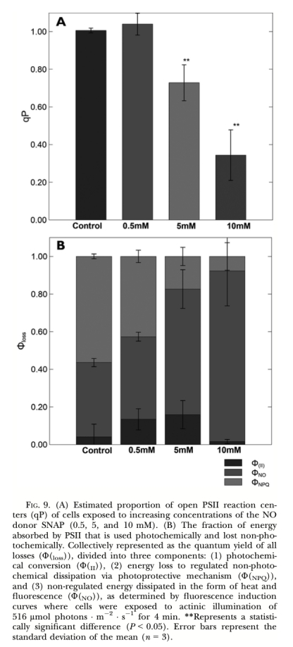 ? qP (光化學淬滅,圖9A): 反映PSII反應中心開放程度(QA氧化態)。意義: 外源NO顯著降低qP(圖9A),表明NO導致反應中心“關閉”,阻礙電子從QA向QB傳遞。