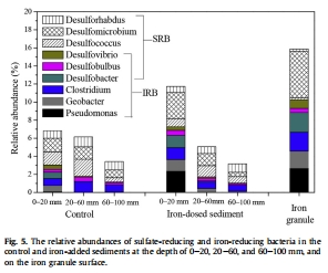 意義:證實顆粒對微生物生態(tài)的影響。鐵還原菌(如Geobacter)豐度增加53%-220%,硫酸鹽還原菌豐度在沉積物中下層降低10%-25%,支持競爭性抑制機制。