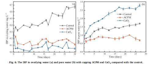 意義:反映覆蓋材料對水體整體環境的影響。ACPM能維持更穩定、適宜的pH和DO水平(圖5),避免了純CaO?導致的pH過高問題。同時,ACPM能有效吸附外源磷,保持上覆水低DIP濃度(圖6a)。