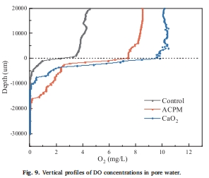提供直觀的微環境證據,揭示機制差異的核心:Unisense微電極能夠以高空間分辨率直接測量沉積物不同深度的溶解氧濃度。圖9 提供的DO剖面數據是證明ACPM優于純CaO?的關鍵性證據。數據顯示,雖然純CaO?組在沉積物-水界面處的DO濃度很高,但其氧滲透深度很淺,DO濃度隨深度增加急劇下降。這表明CaO?釋放的氧大部分快速逸散到上覆水中,未能有效改善深層沉積物的厭氧狀態。相反,ACPM覆蓋下的沉積物,其DO濃度在整個測量剖面(0-30毫米)內都維持在一個較高且穩定的水平,證明ACPM的緩釋特性使其釋放的氧能有效滲透到沉積物深層,創造了更廣泛的好氧微環境。