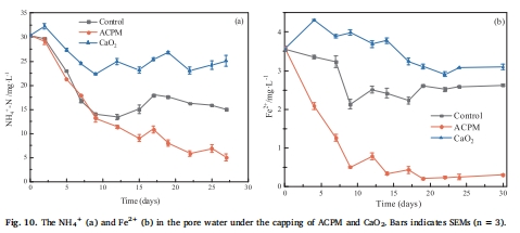 意義:這是揭示內源磷釋放風險和控制機制的核心。ACPM覆蓋下,孔隙水DIP、NH??和Fe2?濃度顯著低于CaO?組和對照組(圖6b, 圖10),表明其創造了更強的氧化環境,有效抑制了磷的釋放。沉積物磷形態分析(圖7)顯示ACPM能更有效地將活性磷(Fe/Al-P)轉化為惰性磷(Ca-P)。
