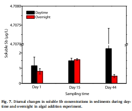 意義:藻華提供DOM并改變微環境,導致Sb濃度晝高夜低(差值最高1.8 μg/L),表明光化學氧化和DOM協同作用。