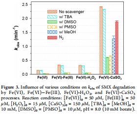 數據來源:圖1顯示Fe(VI) alone和Fe(VI)-CaSO?過程對多種污染物(如SMX、ENR、CBZ)的降解曲線和kobs值。