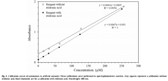 意義:紅、綠通道的線性響應范圍覆蓋環境常見銨濃度(0-3000 μM),使技術兼具高靈敏度(紅通道)和寬量程(綠通道)。etidonic酸的引入消除了海水離子干擾,確保海洋應用的準確性。