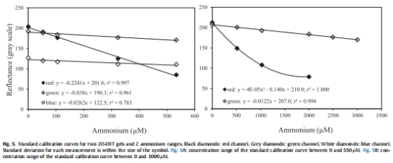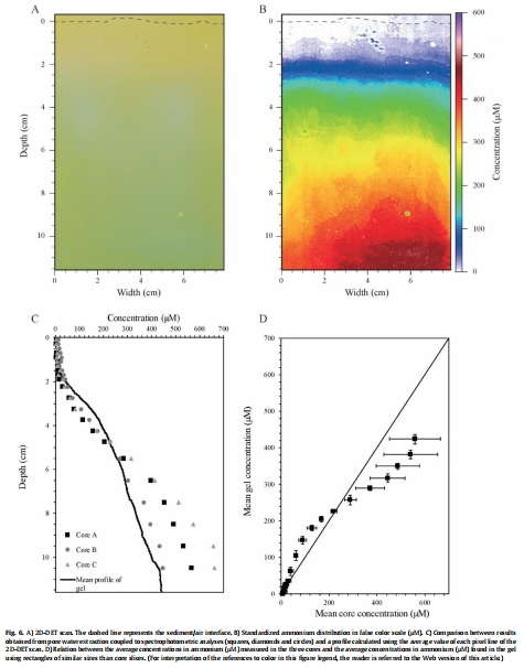 本研究開發了一種新型的二維擴散平衡薄膜技術(2D-DET),用于高分辨率(毫米級)測量沉積物孔隙水中的銨離子(NH??)分布。該技術基于Berthelot顏色反應原理,通過將凝膠探針植入沉積物中實現孔隙水銨離子的原位平衡擴散,隨后疊加顯色試劑凝膠形成綠色復合物,利用平板掃描和光密度分析定量銨濃度。實驗室校準顯示,該方法在去離子水和海水中均有效,檢測范圍為0-3000 μM,檢測限約20 μM,精度±25 μM。現場驗證在法國大西洋沿岸的潮汐泥灘進行,與傳統孔隙水提取-分光光度法對比證實了其可靠性。技術成本低廉,適用于淡水和海洋沉積物,為研究銨在早期成巖作用中的空間異質性提供了新工具。