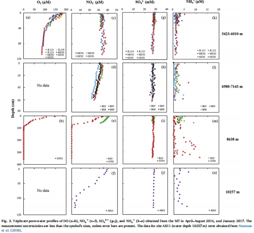 提供關(guān)鍵氧化還原梯度,精準(zhǔn)界定反應(yīng)區(qū):Unisense微電極以毫米級分辨率原位測得的DO剖面(圖2a-b)清晰顯示,從沉積物-水界面(SWI)向下,DO濃度隨深度逐漸降低,但直至最大采樣深度(~110cm)也未被完全耗盡(除GT01站)。這直接證實(shí)了超深淵沉積物整體上處于氧化性環(huán)境,好氧呼吸是可行的。其提供的精確氧化還原梯度是后續(xù)模型計(jì)算O?消耗通量和速率的基礎(chǔ)輸入?yún)?shù)。
