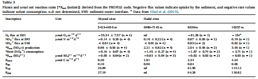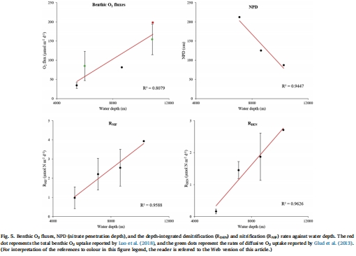 意義:模型計(jì)算出的O?消耗通量、硝化與反硝化速率(表3)直接量化了各路徑的絕對貢獻(xiàn)。數(shù)據(jù)顯示總OM氧化速率(27.19–118.82 μmol C m?2 d?1)、反硝化速率均隨水深增加(圖5),證實(shí)了超深淵區(qū)域OM降解的增強(qiáng)。