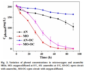 微氧條件是實現(xiàn)苯酚在MES中快速完全降解的關(guān)鍵,且經(jīng)過適應(yīng)后不影響電流產(chǎn)生。
