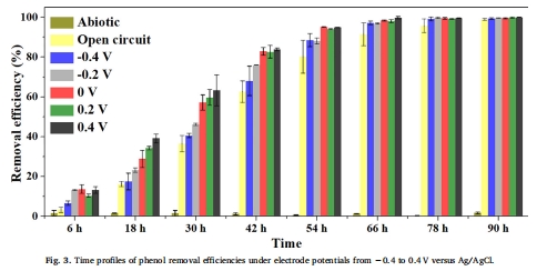 研究意義:圖2 直接證明氧氣是驅(qū)動苯酚高效降解的主要因素,而電流(0V電位)在微氧基礎(chǔ)上進一步加速了降解過程。圖3 則清晰地表明,更正的電極電位(尤其是0V以上)能顯著提升苯酚降解速率,將電位與降解效能直接關(guān)聯(lián)。