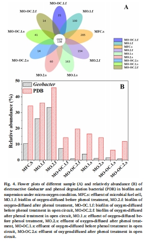 數(shù)據(jù)來源:圖4 通過花瓣圖和相對豐度圖展示了不同樣品中共享OTU的情況以及Geobacter和苯酚降解菌的相對豐度。