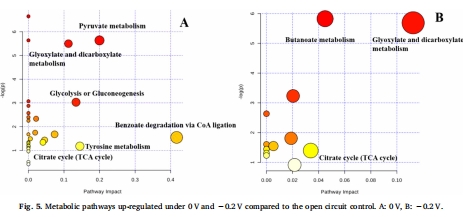 數(shù)據(jù)來源:圖5 和圖6 展示了在0V和-0.2V電位下,相較于開路對照,被顯著上調(diào)的代謝通路以及推測的代謝網(wǎng)絡(luò)。