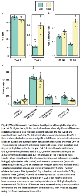 化學表征:綜合利用傅里葉變換紅外光譜(FTIR)、熱化學裂解-氣相色譜質譜(TMAH-GC/MS) 和核磁共振(NMR),對比分析甲蟲攝入的橡木和排出的糞便(frass)在化學組成上的變化,從宏觀上確認木質纖維素(纖維素、半纖維素、木質素)的降解和轉化。