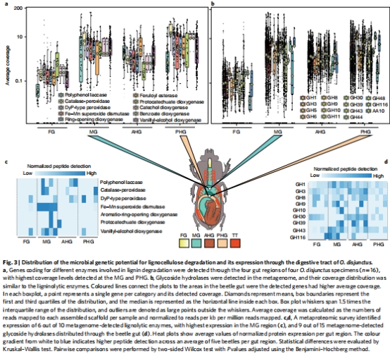 腸道解剖特性和微生物功能組裝促進了木質纖維素的解構和木食性甲蟲的群體生存