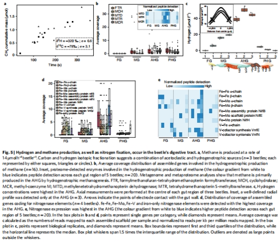 研究意義:圖5c 是關鍵數據之一,它顯示氫氣濃度在AHG區域達到最高(33-44 μM)。這一高氫分壓環境抑制了產甲烷作用(因其熱力學不利),促進了同型產乙酸作用(將H?和CO?轉化為乙酸,為宿主提供能量)。同時,圖5d,e 表明固氮作用(氮酶)也主要在AHG區域高度活躍,解釋了糞便氮含量升高的直接原因。這些數據揭示了AHG作為一個獨特的厭氧生物反應器,其功能深受其物理結構(厚壁防氧滲入)塑造的化學環境(高H?)所調控。