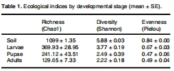 研究意義:數據顯示,土壤的微生物豐富度和多樣性最高。在昆蟲體內,幼蟲期的微生物多樣性最高,而成蟲期最低。這表明在發育過程中,昆蟲腸道對微生物進行了強烈的選擇性篩選,蛹期是一個關鍵的瓶頸階段。