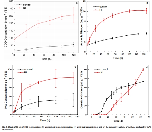 動力學分析證實RL使水解和酸生成速率常數分別提高2倍和1.5倍,雖延遲甲烷生產但最終提高甲烷產量(35.5%增加)。