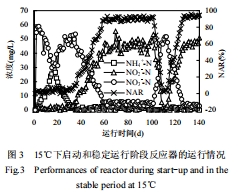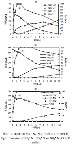 數(shù)據(jù):R1的NAR較低(NO3--N生成多),R2和R3的NAR均達90%左右,且?guī)缀鯚oNO3--N產(chǎn)生。大粒徑AGS(R3)的NH4+-N去除率略低于小粒徑。