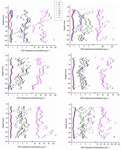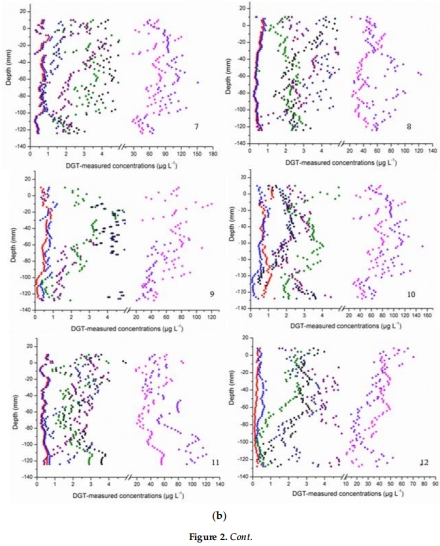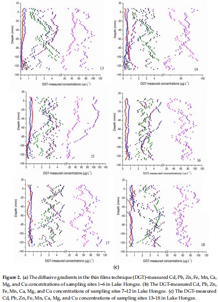 數(shù)據(jù):DGT測量顯示,受調(diào)水影響的站點(如2, 3, 10, 11號點)其活性P(5–300 μg/L)、S(8–138 μg/L)、As(0.17–4.21 μg/L)、Hg(0.05–1.29 μg/L)濃度顯著高于其他站點。重金屬(Cd, Pb, Zn, Fe, Mn, Ca, Mg, Cu)的活性濃度也存在顯著空間變異。