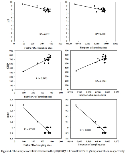 pH、DOC和ORP是驅動微生物群落結構和多樣性的最關鍵環(huán)境因子。pH和DOC升高、ORP降低對微生物多樣性產(chǎn)生負面影響。
