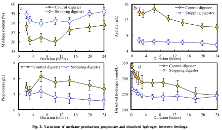 數據:剝離消化器VFA濃度降低30%(從21.6 g/L降至15.1 g/L),溶解氫濃度顯著降低(Fig. 3d)。