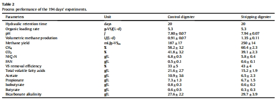 數據:剝離消化器甲烷產量比對照組高34%,TAN濃度降低20%(從6.8 g/L降至5.8 g/L)。